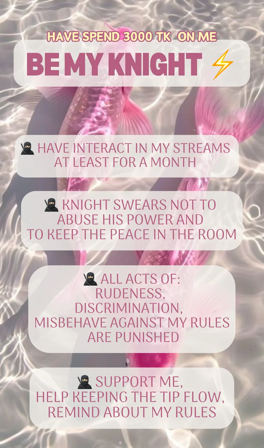 My Chatroom Rules ! : 1. Don’t Beg ! If you have a wish ⭐️TIP⭐️ for it 2. GERMAN or ENGLISH only :) 3. Don’t ask for personal information which isn’t in my profile 🔎 4. Be Polite ! - to me and others. 🌸 5. Respect my KNIGHTS 🥷🏻! Otherwise they will mute you 6. Don’t advertise other models / sites / etc. 7. Don‘t forget to 🩷 if you like me